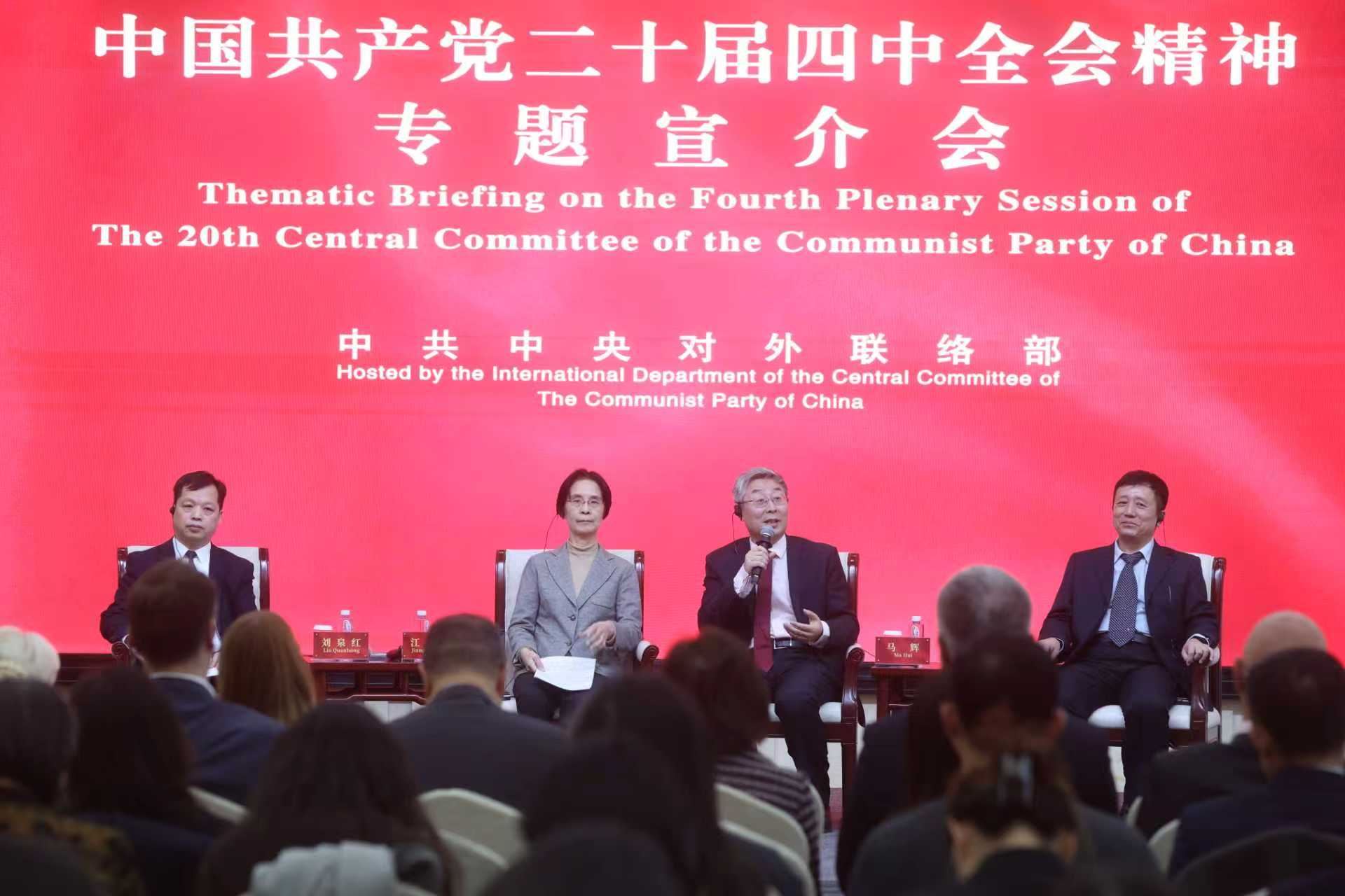 11月17日,中共中央对外联络部面向在华外国工商界举办二十届四中全会精神专题宣介会,来自美国、英国、欧盟、瑞士、日本、新加坡、俄罗斯、中东欧、拉美、非洲等国家和地区的160多位外国政要、在华外国商协会、跨国企业代表和部分驻华使馆经贸官员出席。中联部副部长马辉,国务院原副秘书长、中国社会科学院大学教授江小涓,国家发展和改革委员会产业经济与技术经济研究所所长刘泉红,商务部国际贸易经济合作研究院研究员梅新育,向外方介绍全会主要精神和“十五五”规划建议主要内容。中国经济联络中心主任可志忠主持宣介会。